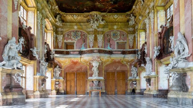 Za potężną fasadą kryją się zachwycające wnętrza z legendarną Salą Książęcą – pełną złocień, fresków i mistrzowskich detali.